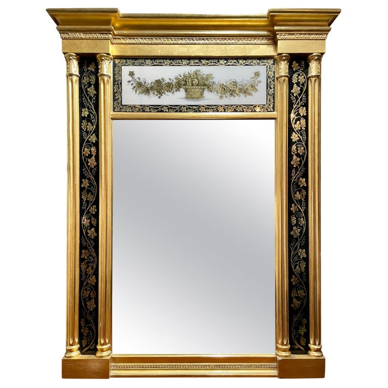 Antique English Gold Leaf and Reverse Painted Glass Eglomise Mirror, Circa 1920