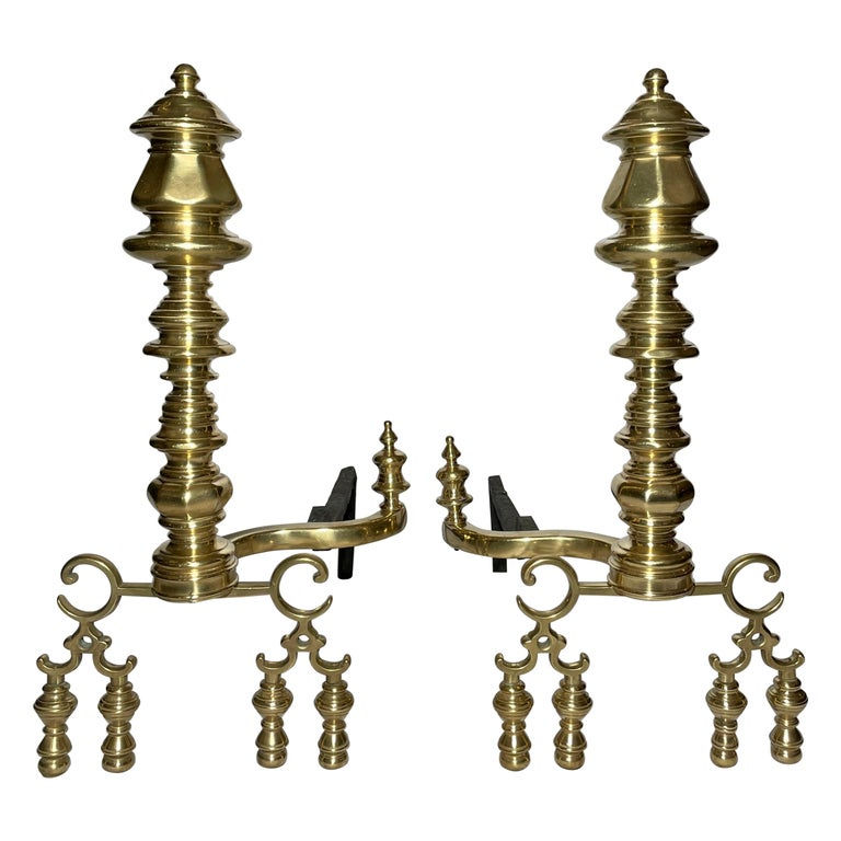 Antique English Polished Brass Fireplace Andirons, Circa 1860