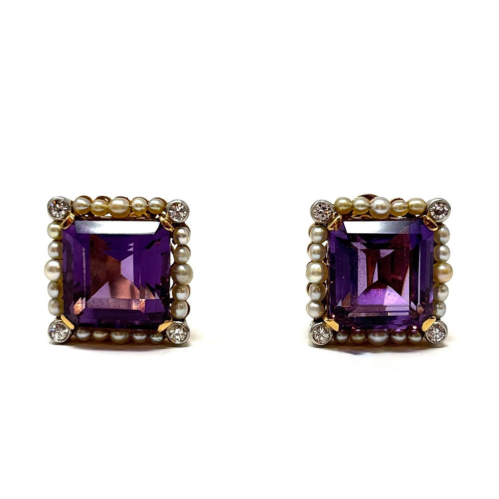 Estate 14K Gold Amethyst, Pearl and Diamond Earrings