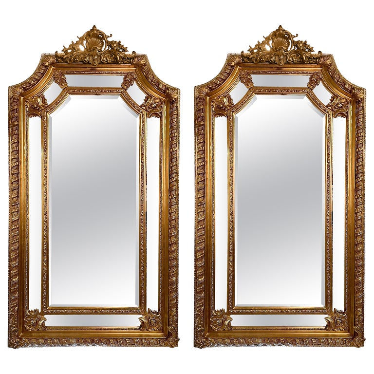 Pair French Louis XVI Style Paneled and Beveled Gold Mirrors
