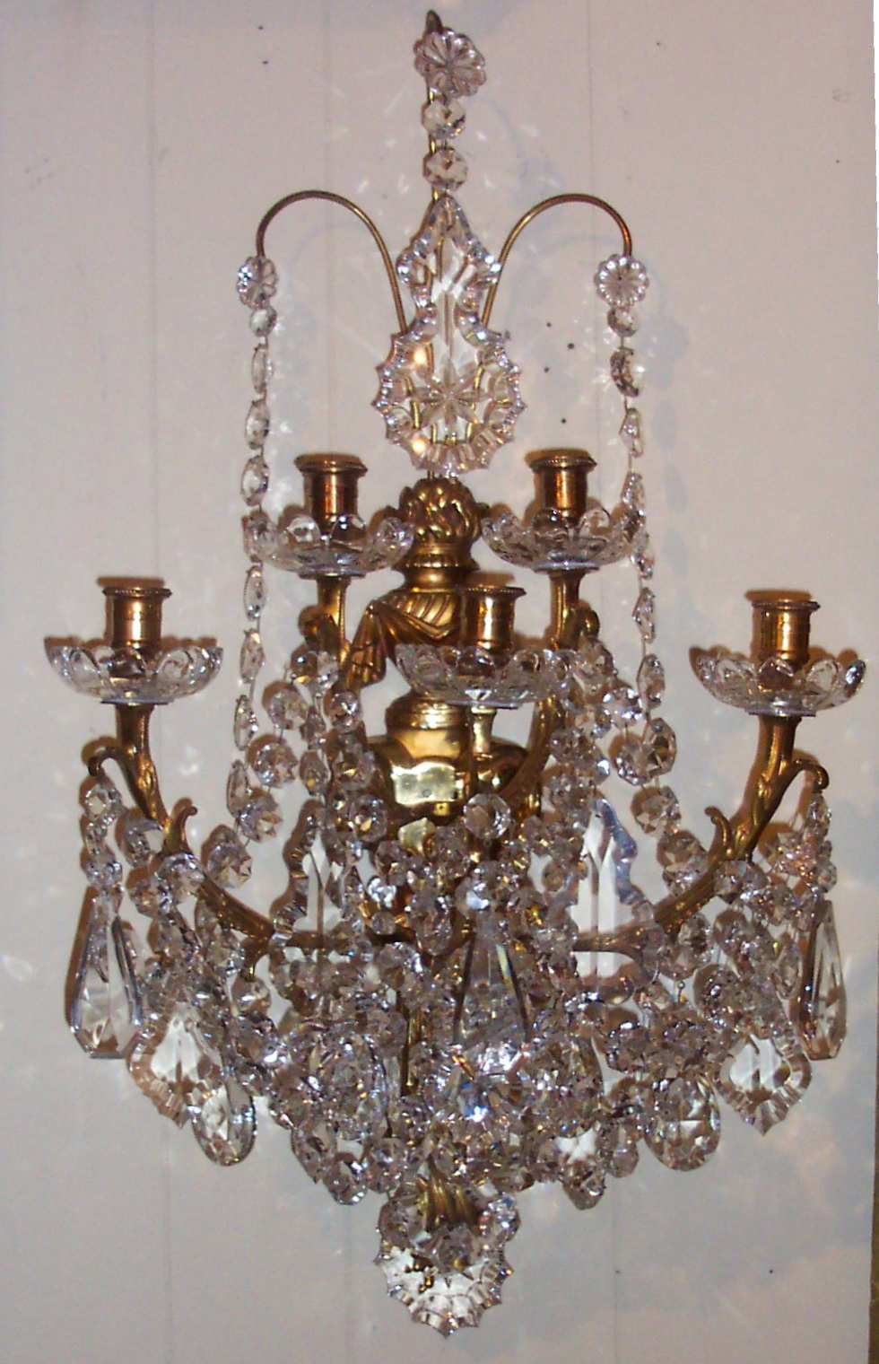 Pair of Antique French Crystal and Ormolu 5 Light Sconces, Circa 1880