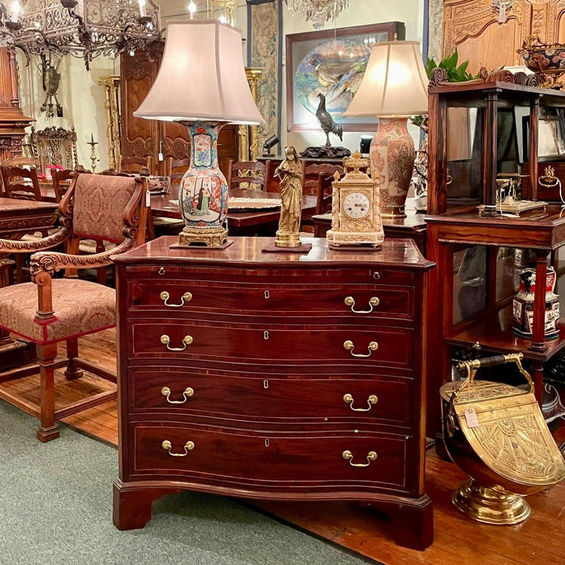 In antique furniture, a serpentine shape refers to a distinctive, curved front design that resembles the sinuous movement of a snake. It was also a common feature in 18th-century English furniture. On pieces like chests of drawers, the serpentine shape accentuates the natural patterns of the wood grain, further enhancing the design.