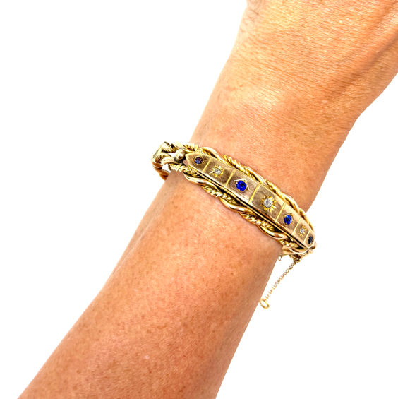 Antique English 9 Carat Gold Etruscan Revival Sapphire and Diamond Bangle