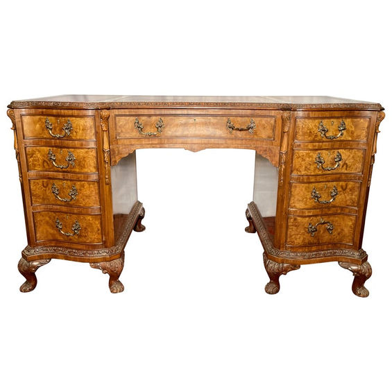 Antique English Burled Walnut Leather Top Desk, Circa 1900