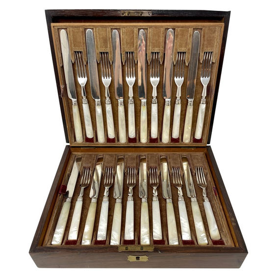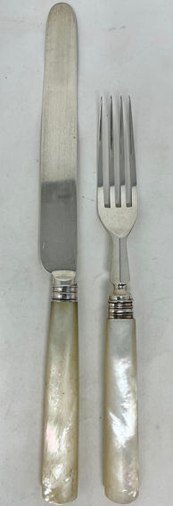 Mother-of-pearl was a popular material for Victorian silverware, particularly for handles on cutlery, serving pieces, and decorative items. It was prized for its iridescent luster and durability, making it a luxurious and attractive choice for both practical and decorative pieces.