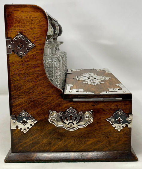 Antique English Silver Plate, Oak and Crystal Games Box Tantalus, Circa 1880's.