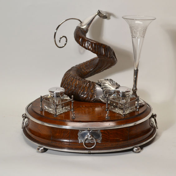 Antique English Trophy Horn Desk Inkwell, Circa 1880