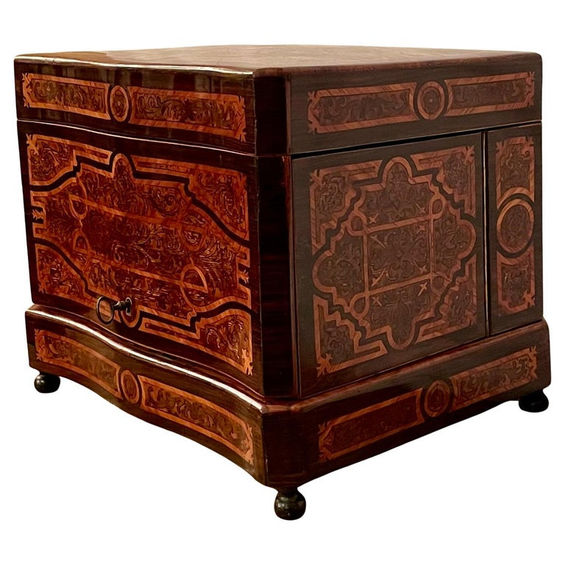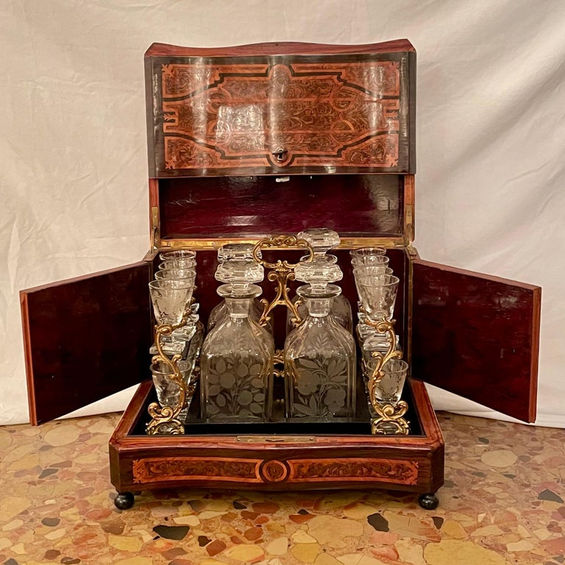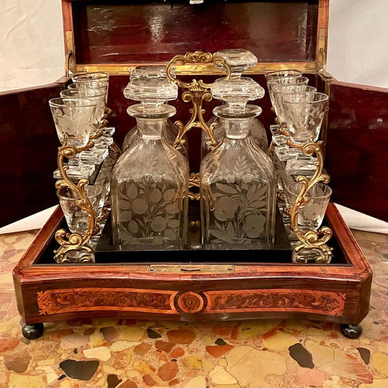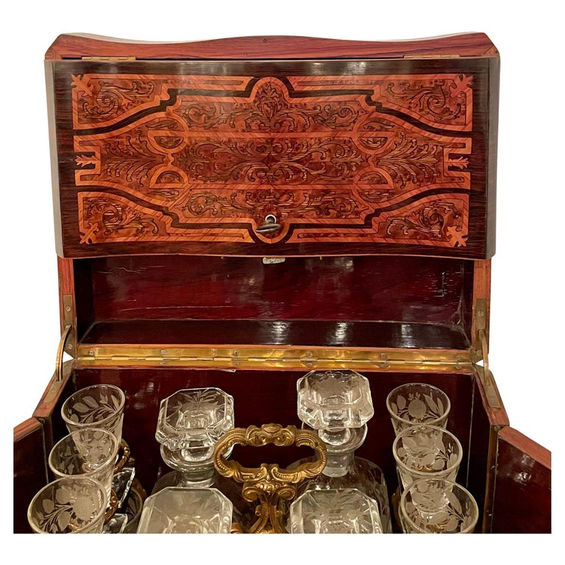 Antique French Exotic Wood Inlay & Baccarat Crystal Cave à Liqueur, Circa 1880.