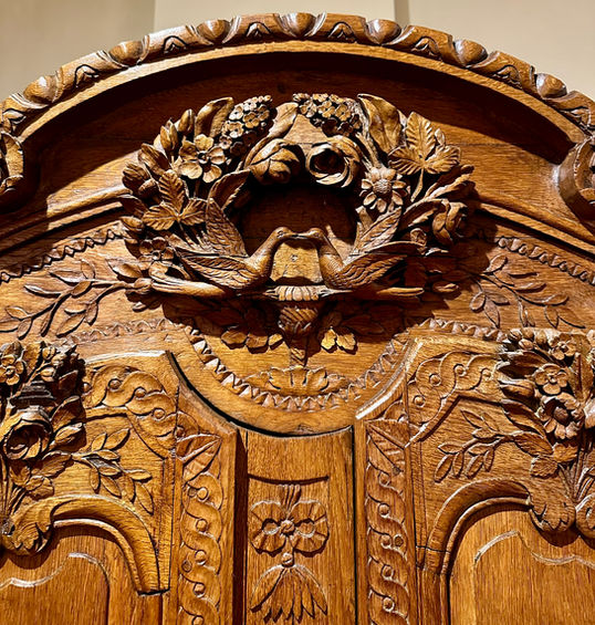 An armoire de mariage is a traditional French marriage wardrobe, often given as a wedding gift, especially in Normandy. These pieces are typically ornately carved with symbolic motifs like flowers for fertility, overflowing baskets for abundance, and doves for marital bliss. They were designed to provide a place for the newlyweds to store their linens and clothing, symbolizing the establishment of their new household.