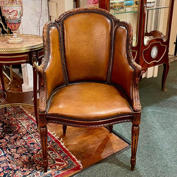 Antique French Louis XVI Style Carved Walnut and Leather Armchair, Circa 1890's.
