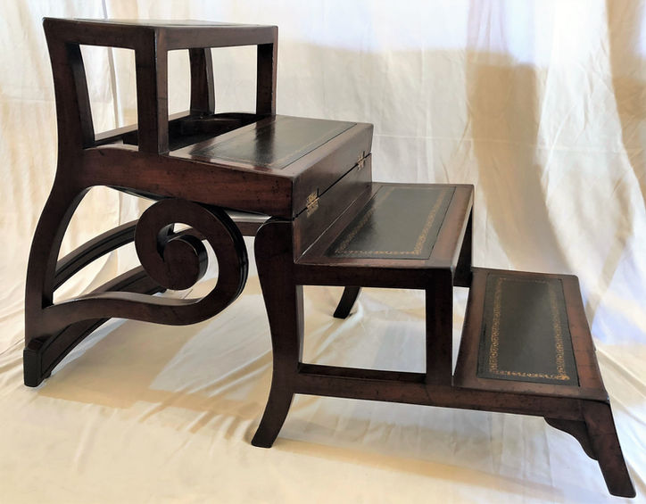 A metamorphic chair, often seen in libraries or offices, can transform from a regular chair into a set of library steps. These chairs were popular in the mid-18th century and designed for European nobility and the English aristocracy. They were a space-saving solution, allowing users to reach high shelves without needing a separate ladder.