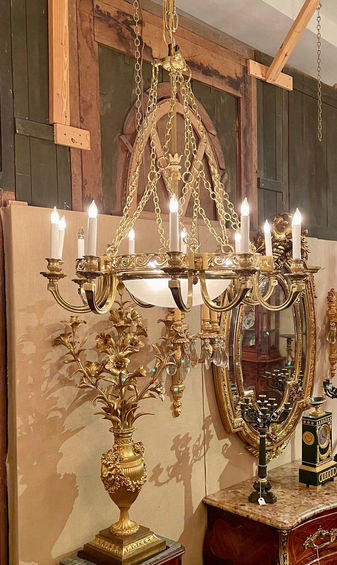 Estate Art Deco French Gold Bronze & Smoked Glass Chandelier, Circa 1920-1940.