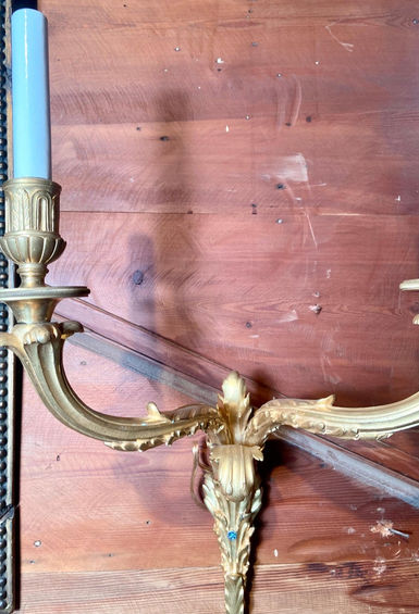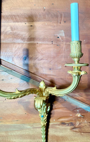 Bronze d'oré, also known as ormolu or gilt bronze, was a decorative finish used on luxury furnishings in the 18th and 19th centuries. An application of finely ground high carat gold and mercury amalgam was placed on objects of bronze. When subjected to extremely high heat, the mercury evaporated, leaving behind a lustrous coating of gold, as can be seen on these beautiful sconces.