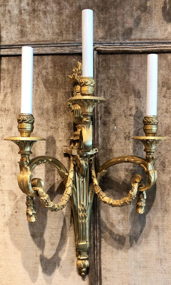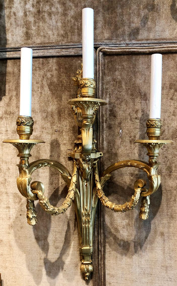 Pair Antique French Louis XVI Bronze D'ore Wall Sconces, Circa 1860