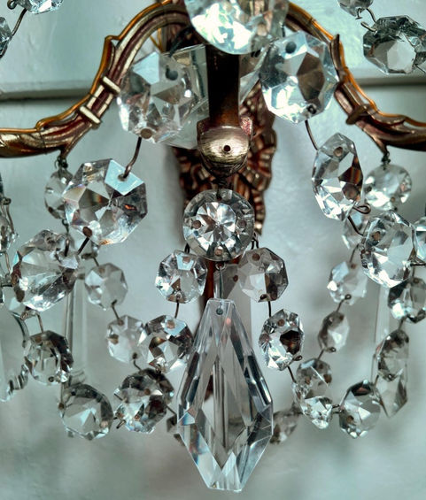 Pair Antique French Louis XVI Gold Bronze and Crystal Wall Sconces, Circa 1890