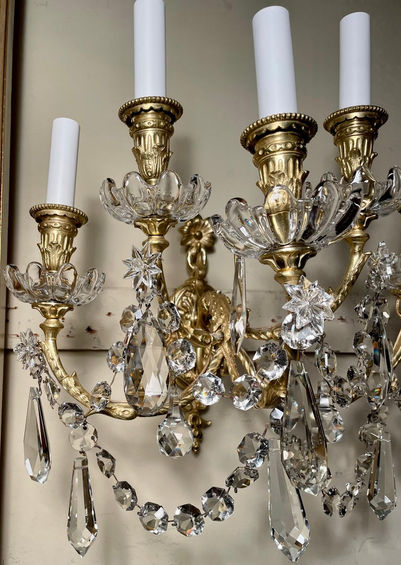 Pair Antique French Ormolu & Baccarat Crystal 5 Light Sconces, Circa 1890