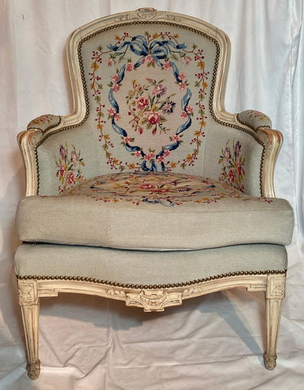 Pair Antique French Painted Carved Walnut & Needlepoint Upholstered Armchairs