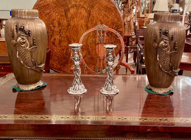 Pair of Antique English Art Nouveau Silver Plated Candlesticks, Circa 1900-1920.