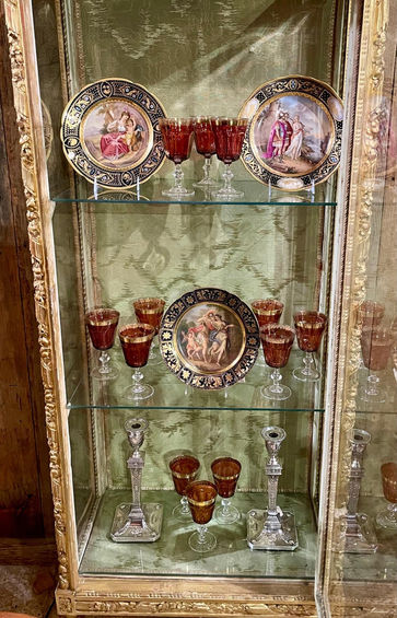 Set of 12 Cranberry Glass and Wide Gold-Rimmed Wine Goblets.