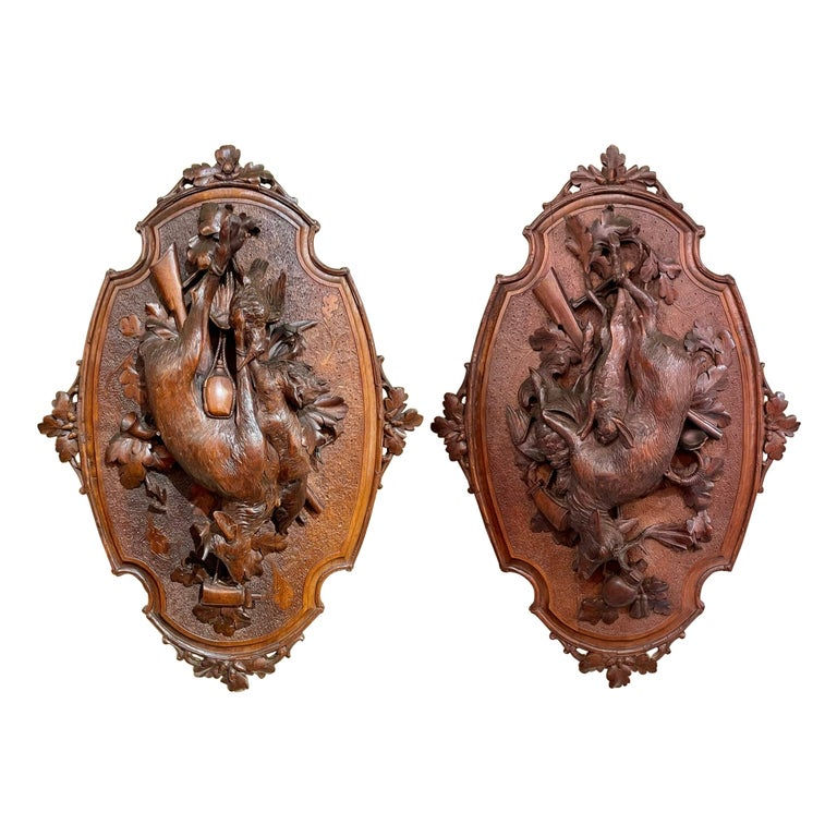 Pair Antique German Black Forest Walnut "Natur Mort" Wall Plaques, Circa 1890.